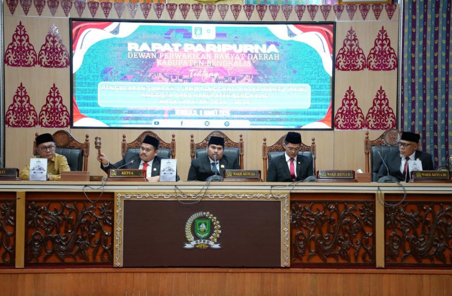 Bengkalis – Ketua KPU Kabupaten Bengkalis, Agung Kurniawan menghadiri Rapat Paripurna DPRD Kabupaten Bengkalis dalam rangka pengucapan sumpah/janji Pengganti Antar Waktu (PAW) Anggota DPRD Kabupaten Bengkalis masa jabatan 2024–2029 dari Partai Demokrasi Indonesia Perjuangan (PDIP), Sahat Marganda Tobing pada Senin (09/03/2026) di Ruang Rapat Paripurna Kantor DPRD Bengkalis, Jl. Antara No.77, Bengkalis. Rapat paripurna dipimpin langsung oleh Ketua DPRD Kabupaten Bengkalis, Septian Nugraha didampingi Wakil Ketua I DPRD M.Arsya Fadilah, Wakil Ketua II Hendrik Firnanda Pangaribuan serta Wakil Kerua III H. Misnu bersama sejumlah Anggota DPRD yang hadir. Rapat dilakukan dengan agenda pengucapan sumpah/janji PAW anggota DPRD yang menggantikan Al Azmi (almarhum). Pelaksanaan PAW ini merupakan tindak lanjut dari Surat Keputusan Gubernur Riau Nomor 130/II/2026 tentang pemberhentian anggota DPRD Kabupaten Bengkalis atas nama Al Azmi serta peresmian pengangkatan Sahat Marganda Tobing sebagai anggota DPRD Kabupaten Bengkalis masa jabatan 2024–2029. Dengan dilaksanakannya pengucapan sumpah/janji tersebut, Sahat Marganda Tobing resmi menjabat sebagai anggota DPRD Kabupaten Bengkalis untuk sisa masa jabatan 2024–2029. Usai pelaksanaan rapat paripurna, Ketua KPU Kabupaten Bengkalis Agung Kurniawan turut menyampaikan ucapan selamat secara langsung kepada Sahat Marganda Tobing atas pelantikannya sebagai Anggota DPRD Kabupaten Bengkalis dan berharap dapat menjalankan amanah dengan baik dalam menjalankan tugas sebagai wakil rakyat. (Humas/ed:chip) ....