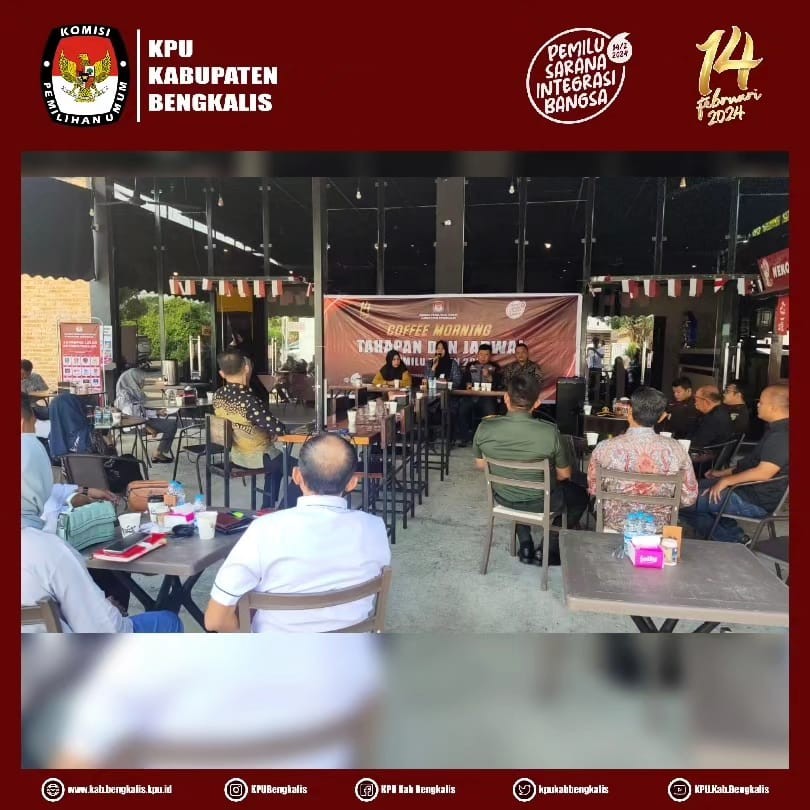 Bengkalis - KPU Kabupaten Bengkalis lakukan kegiatan Coffee Morning “Tahapan dan Jadwa Pemilihan Umum Tahun 2024” bersama dengan Partai Politik, Forkopimda dan Stakeholder yang dilaksanakan pada hari Kamis (21/9) di Kafe Fanelco Jalan Pertanian Bengkalis.