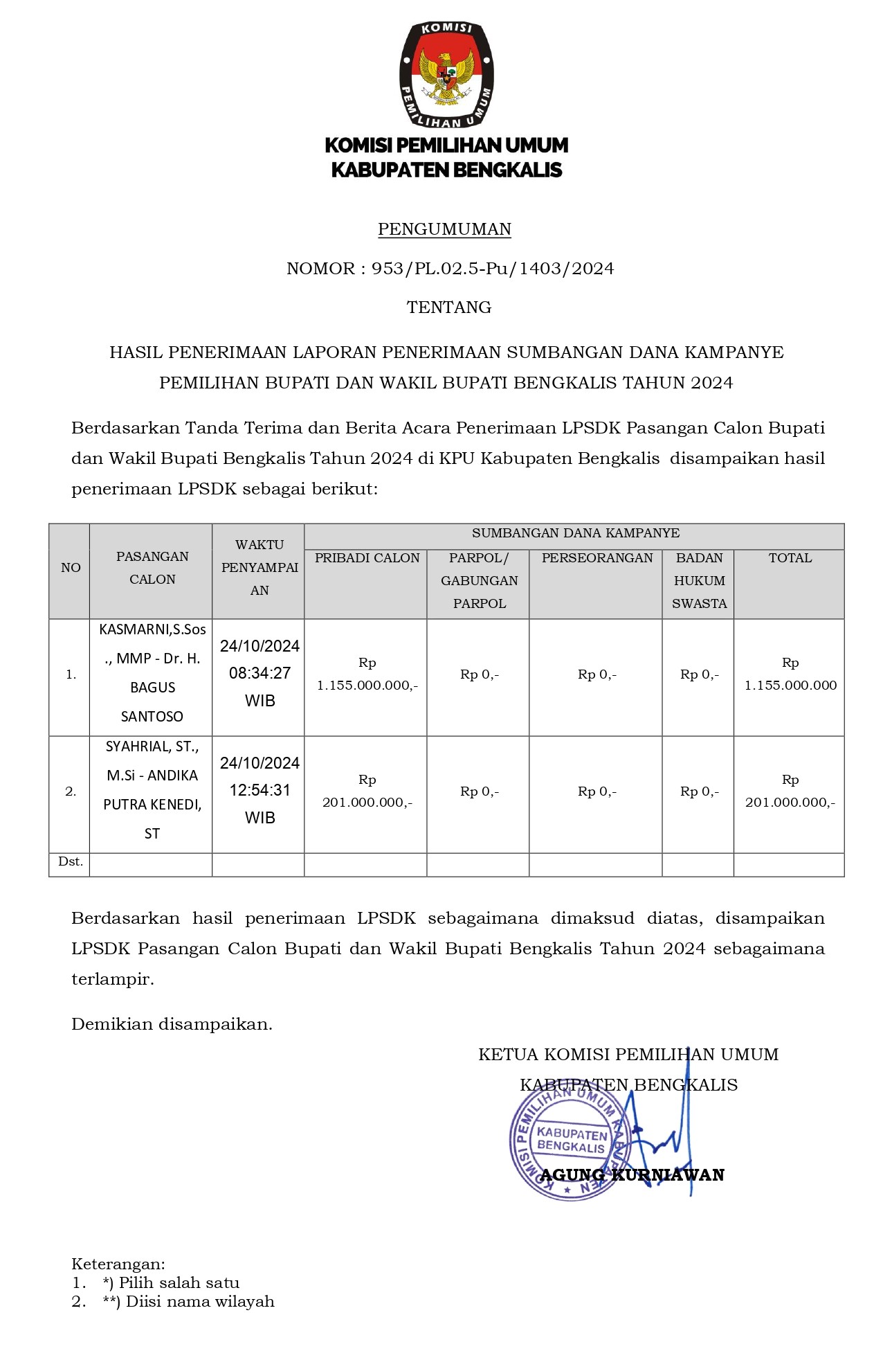 PENGUMUMAN HASIL PENERIMAAN LAPORAN PENERIMAAN SUMBANGAN DANA KAMPANYE PEMILIHAN BUPATI DAN WAKIL BUPATI BENGKALIS TAHUN 2024 Sabtu, 26 Oktober 2024 00:00 1019 DOWNLOAD Bagikan: Telah dilihat 1,019 kali