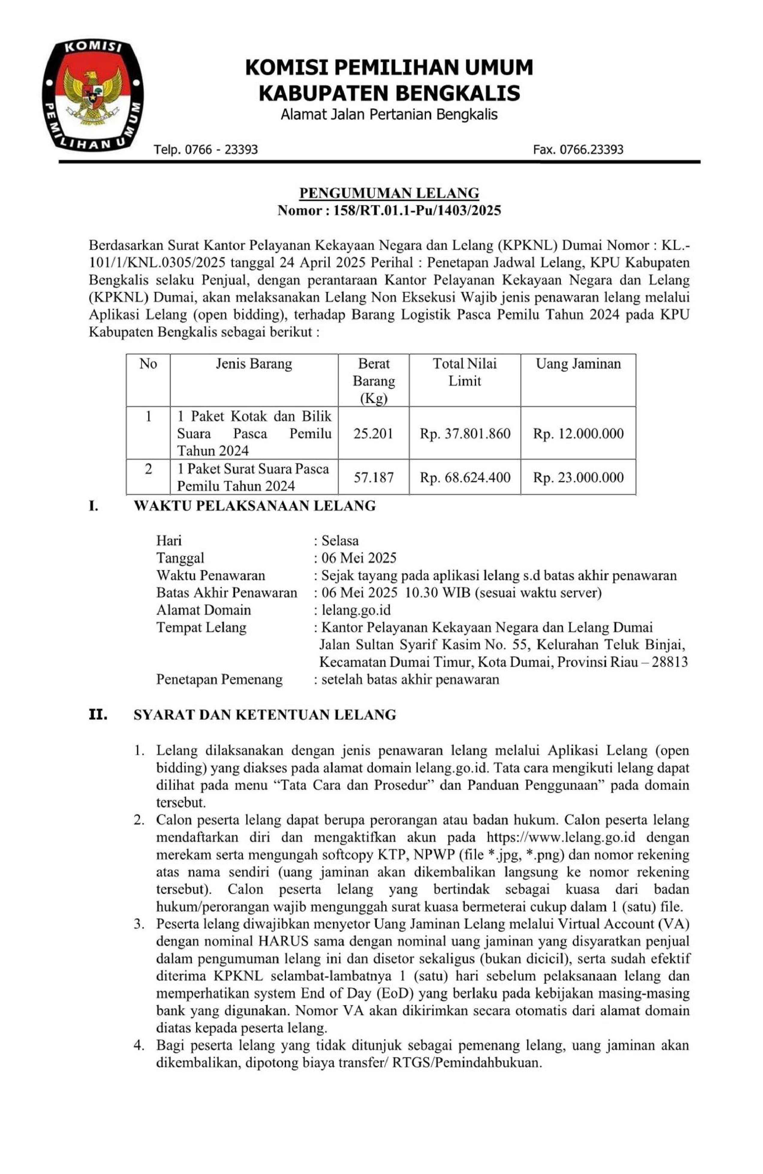 PENGUMUMAN LELANG BARANG LOGISTIK PASCA PEMILU TAHUN 2024