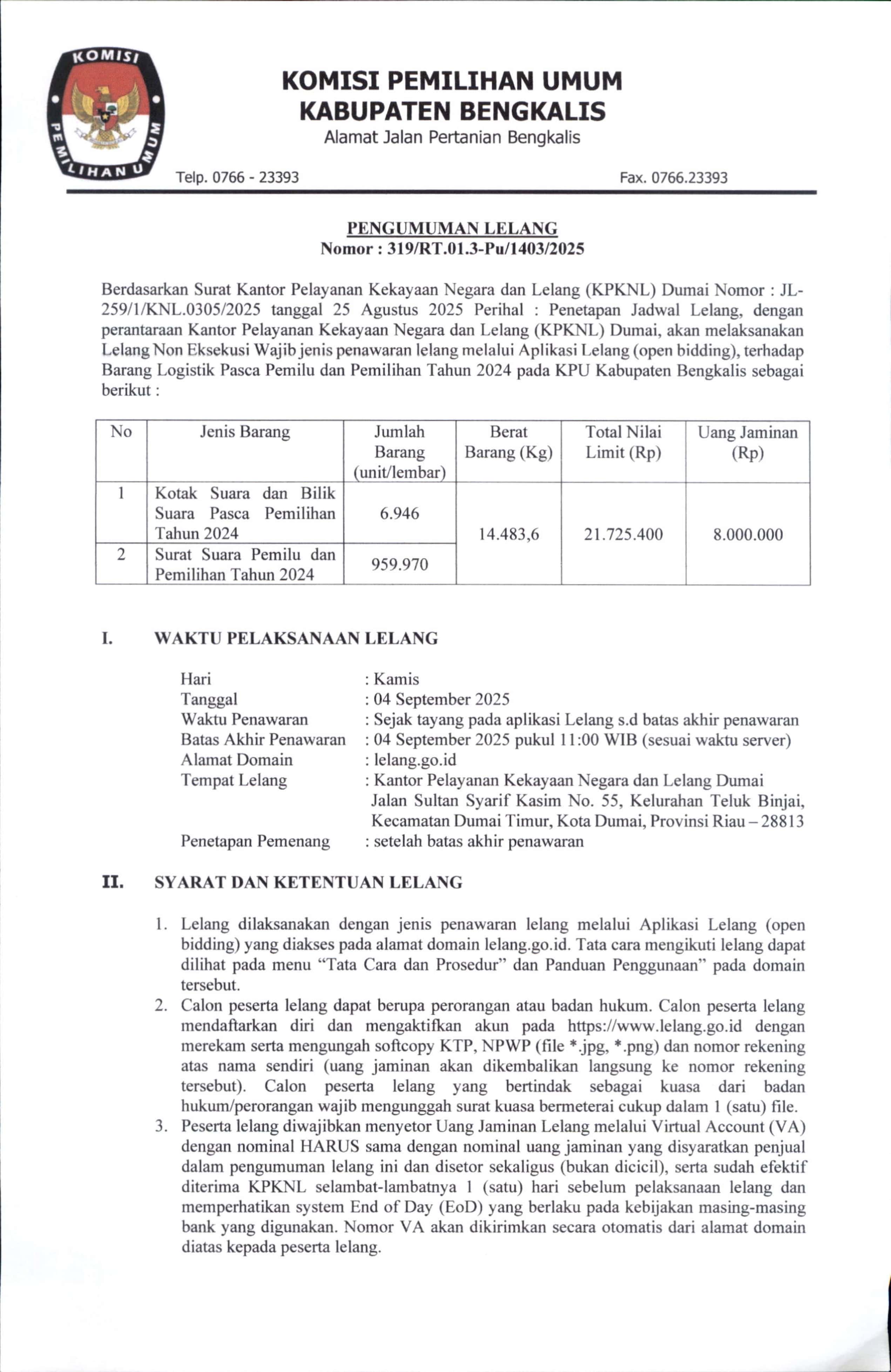 Hai #TemanPemilih, Berikut Pengumuman Lelang Barang Logistik Pasca Pemilu di KPU Kabupaten Bengkalis melalui perantara Kantor Pelayanan Kekayaan Negara (KPKNL) Dumai.