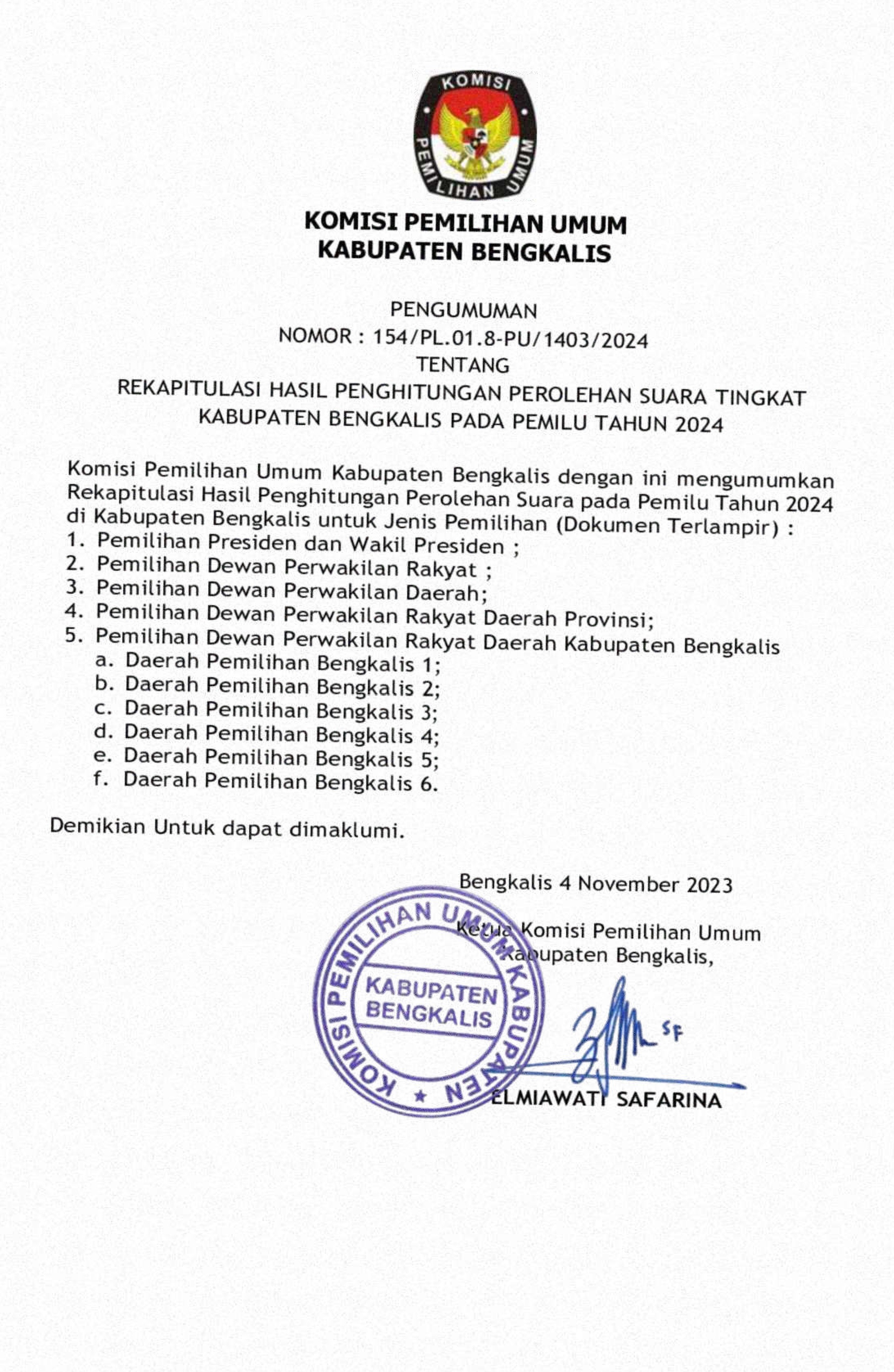 Pengumuman Penetapan Hasil Rekapitulasi Perolehan Suara Tingkat Kabupaten Bengkalis Pada Pemilu 2024 Senin, 04 Maret 2024 00:00 1728 DOWNLOAD SELENGKAPNYA DISINI Bagikan: Telah dilihat 1,728 kali