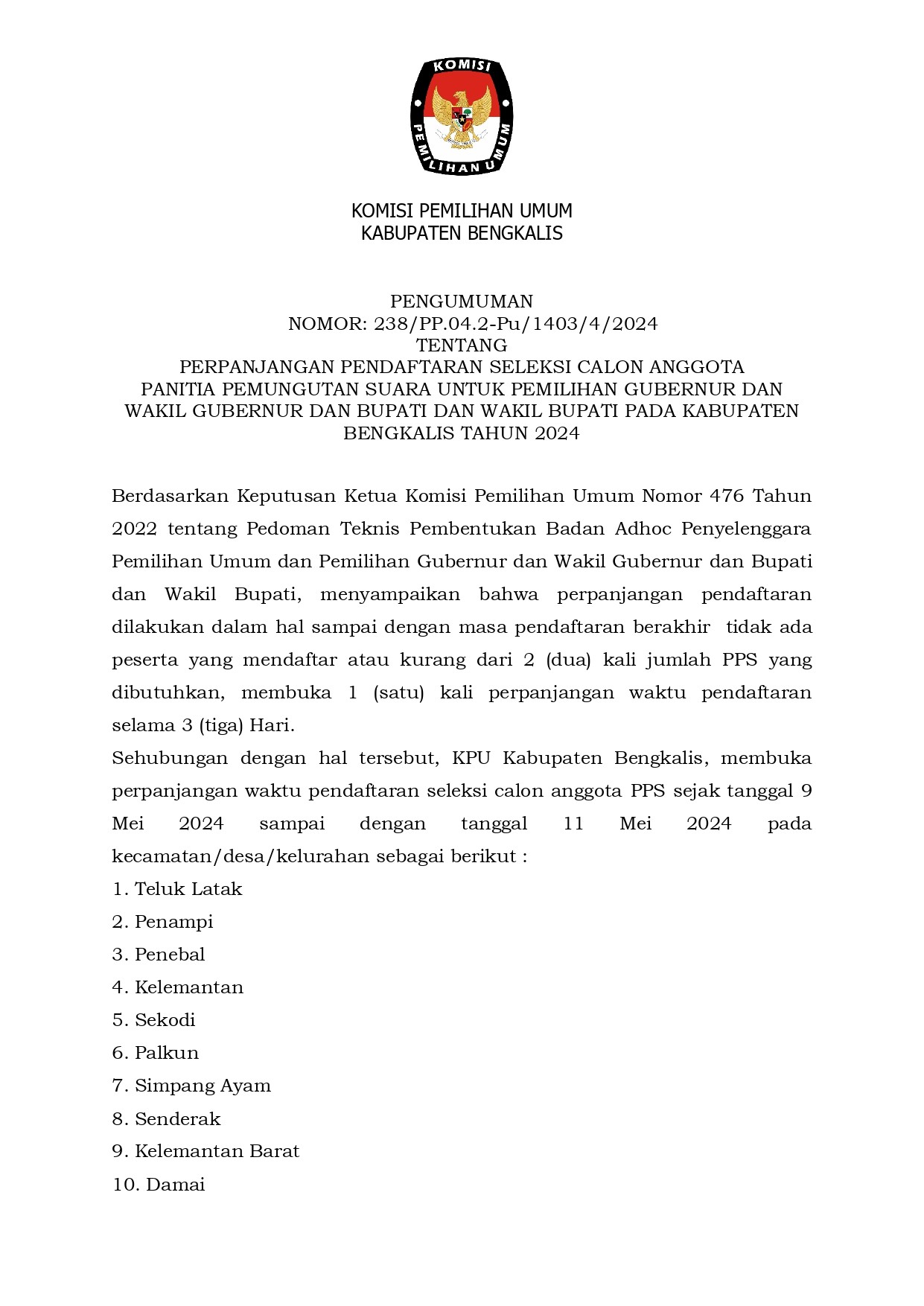 Pengumuman Perpanjangan Pendaftaran Seleksi Calon Anggota Panitia Pemungutan Suara Untuk Pemilihan Gubernur dan Wakil Gubernur dan Bupati dan Wakil Bupati Bengkalis Tahun 2024