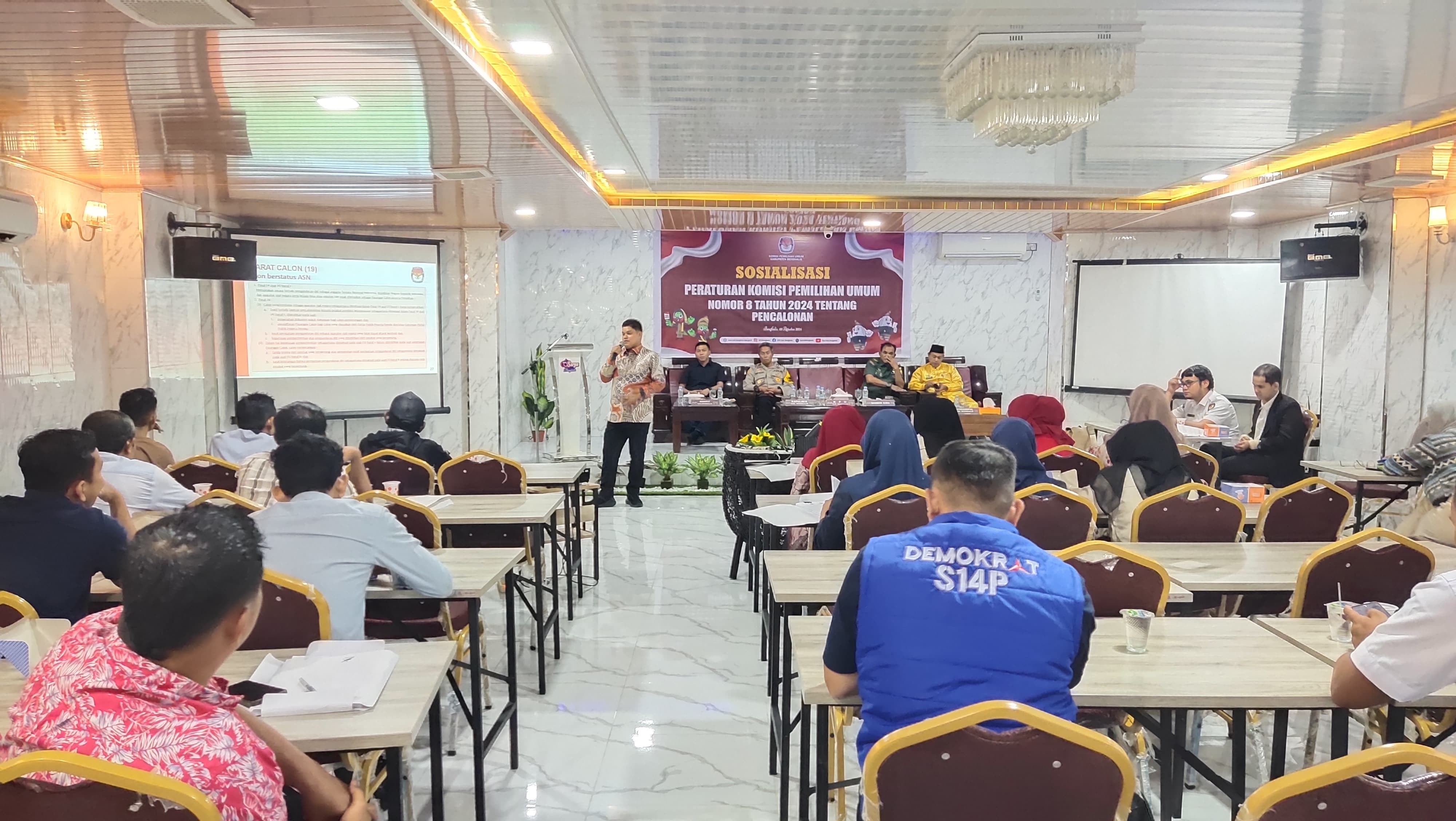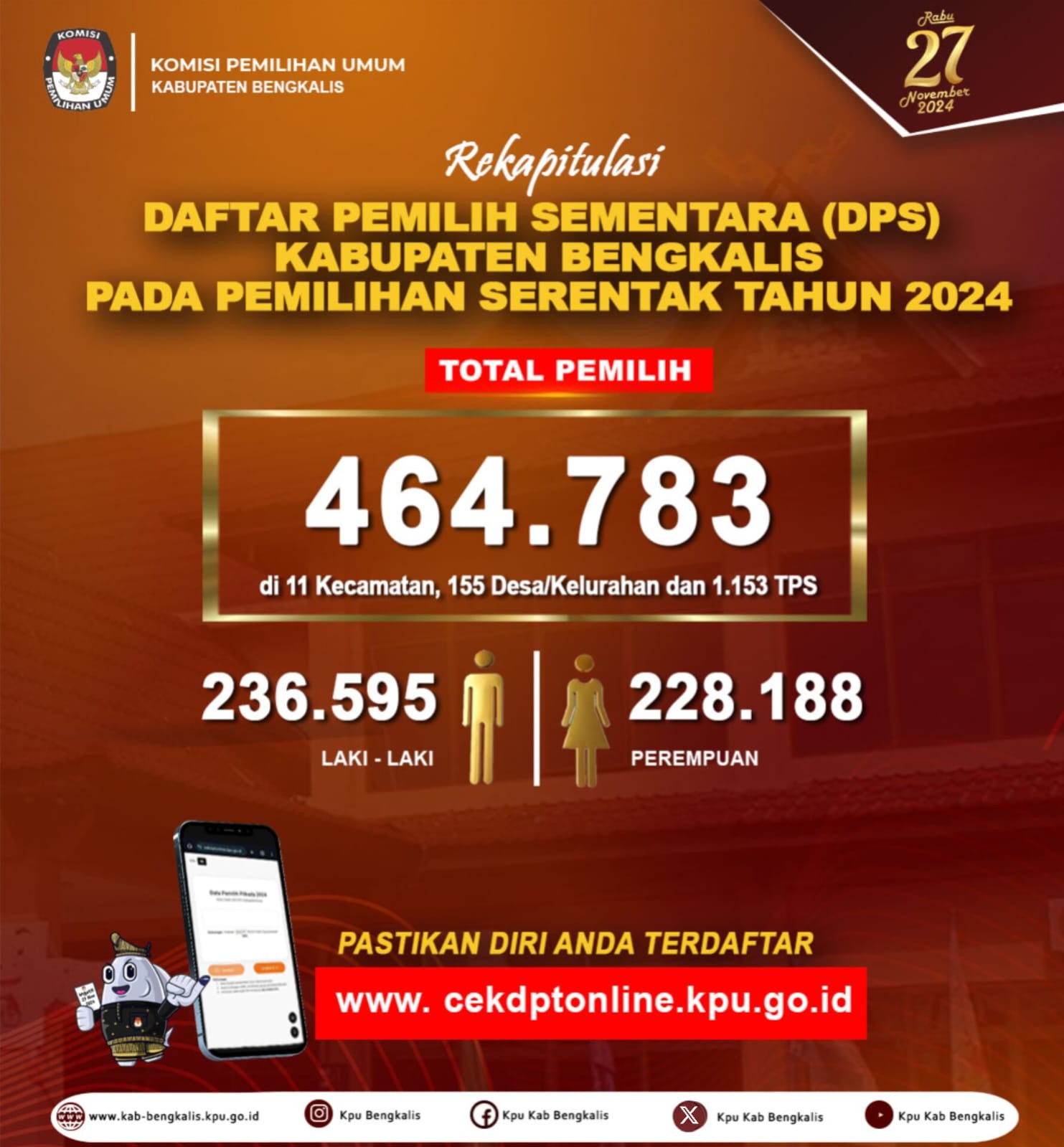 KPU Bengkalis - Komisi Pemilihan Umum (KPU) Kabupaten Bengkalis melalui Rapat Pleno, telah menetapkan Daftar Pemilih Sementara untuk Pemilihan Bupati dan Wakil Bupati Bengkalis Tahun 2024 mendatang Penetapan itu dilakukan melalui Rapat Pleno Terbuka Rekapitulasi dan Penetapan DPS yang telah dilaksanakan pada Sabtu (10/8/2024) di Gedung Daerah Bengkalis yang dipimpin langsung Ketua KPU Bengkalis Agung Kurniawan dan didampingi empat komisioner lainnya serta dihadiri sejumlah peserta lainnya. Ketua KPU mengatakan bahwa Daftar Pemilih Sementara Pilkada Serentak 2024 ini tersebar di 1.153 TPS yang ada di 155 desa, 11 kecamatan se-Kabupaten Bengkalis. Secara rinci ada sebanyak 236.595 pemilih laki-laki dan 228.188 perempuan dengan total 464.783 pemilih. "Jumlah tersebut masih bersifat sementara karena masih ada ruang untuk perbaikan sebelum ditetapkan menjadi Daftar Pemilh Tetap (DPT) Pilkada Serentak Tahun 2024 karena masyarakat masih bisa memberi tanggapan dan masukan terhadap DPS tersebut setelah di umumkan kembali ke masyarakat ," kata Agung Kurniawan, usai Rapat Pleno. Kemudian dijelaskan oleh Sri Jumarni, komioner yang membidangi Data Pemilih, bahwa pemilih untuk satu TPS pada helat Pilkada serentak 2024 nantinya maksimal berjumlah 600 pemilih. Selanjutnya diharapkan kepada masyarakat dan peserta pemilihan untuk dapat melakukan pencermatan terhadap DPS yang akan kita turunkan dan umumkan kembali dalam waktu tidak lama lagi yang tersebar di seluruh TPS. Dalam rapat pleno tersebut selain seluruh Panitia Pemilihan Kecamatan (PPK) dari 11 kecamtan di Bengkalis, juga turut hadir Forkopimda Bengkalis, Banwaslu Bengkalis, perwakilan Pemerintah Daerah bagian Tata Pemerintahan Bengkalis. (Humas KPU)