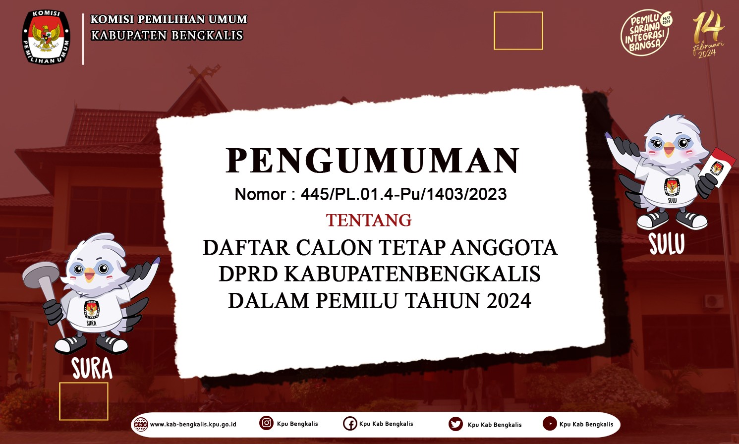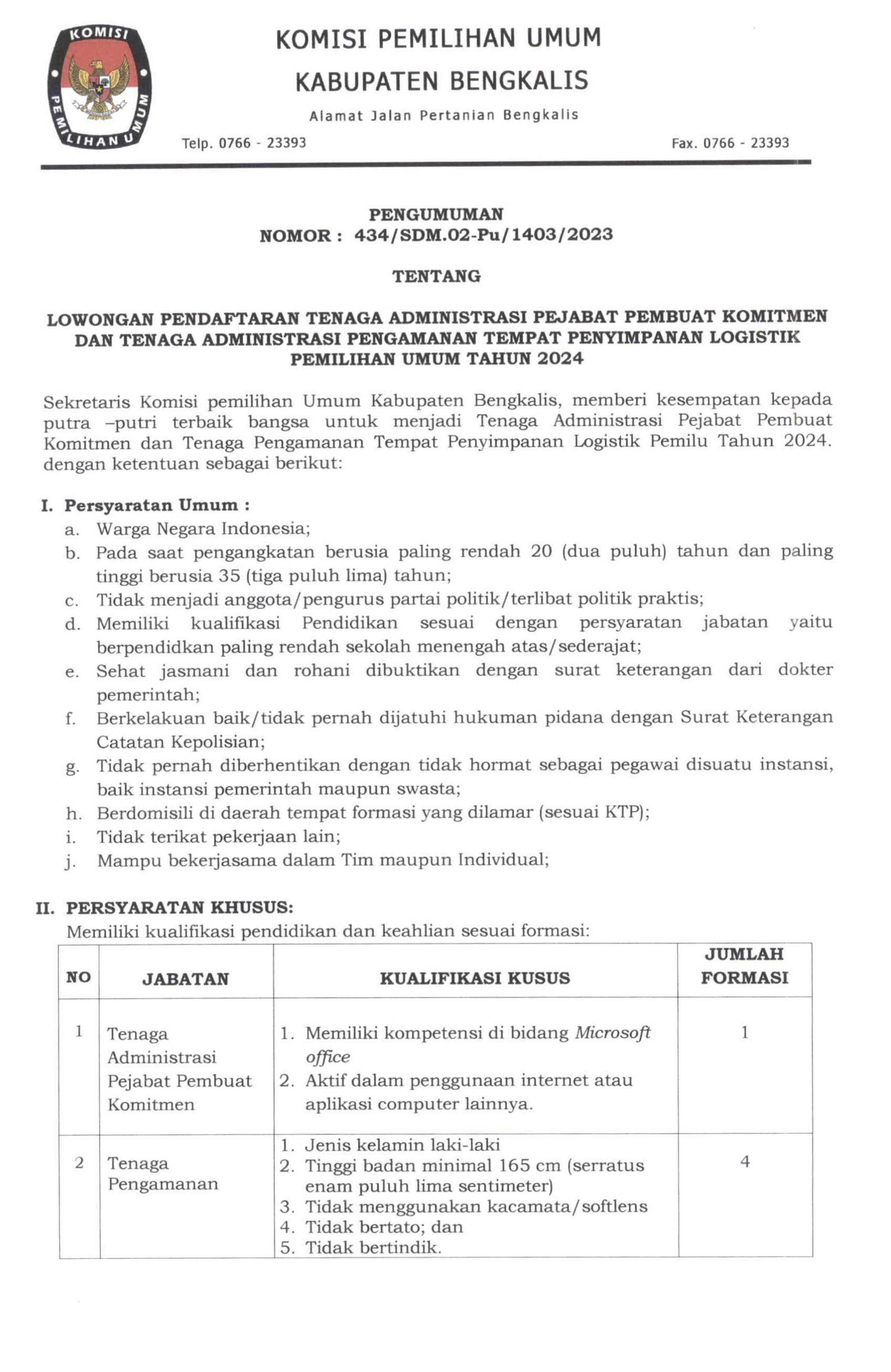 PENGUMUMAN TENTANG HASIL PENELITIAN ADMINISTRASI CALON ANGGOTA KELOMPOK PENYELENGGARA PEMUNGUTAN SUARA UNTUK PEMILIHAN UMUM TAHUN 2024 SE- KABUPATEN BENGKALIS